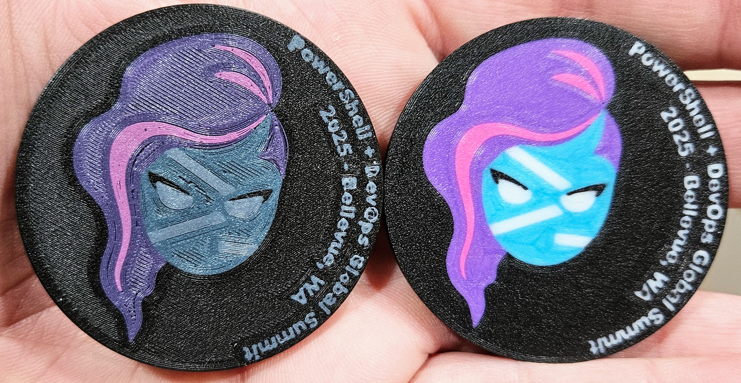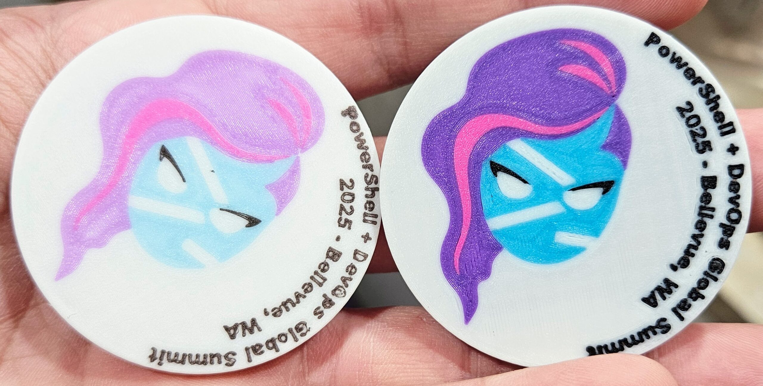 I attempted (and I did it!) a multi-color, light/dark mode ‘challenge coin’ of the PowerShell 7 (core?) mascot/hero. Two-sided, five colors on each layer… Check out the first attempt, and then the color corrected production samples!